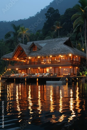 Fototapeta premium Ecotourism, luxurious thatched-roof villa on a serene lake, surrounded by...