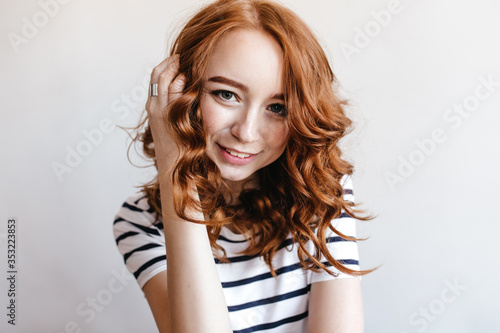 © Look!, Fototapeta premium Ecstatic girl wears ring touching her ginger hair. Indoor portrait of inspired female model in casual outfit isolated on white background.