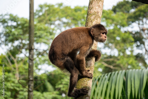 Naklejka premium Ecuadorian capuchin (Cebus aequatorialis) climbing a tree at a jungle lodge in Archidona, in Napo province, Ecuador