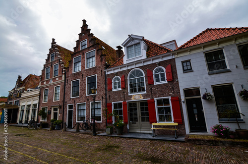 © Massimo Parisi, Naklejka premium Edam, the Netherlands, August 2019. The architecture of the Edam lodges is a characteristic example of the Netherlands. Red brick facade and red windows. Very fascinating.