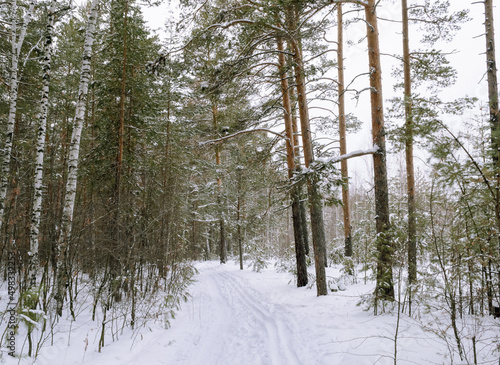 Fototapeta premium Edge of a mixed winter forest under a cloudy sky