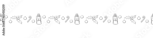 Obraz premium Edging, ribbon, border of contour festive Christmas symbols in doodle style. Vector seamless pattern, ornament, decorative element, decoration for New Year, xmas design