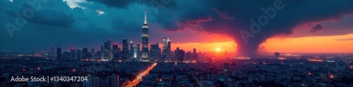 © เดือน สุขทั่วญาติ, Fototapeta premium Edgy cityscape at dusk with towering skyscrapers and a dark ominous cloud, grungeaesthetic, citynightlife