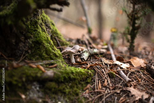 © Ksu, Obraz premium edible mushrooms in the autumn forest on moss-covered trees