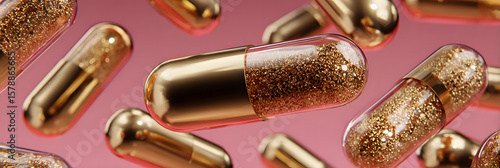 © john, Naklejka premium edible retinol supplements golden gel capsules floating, brown background.