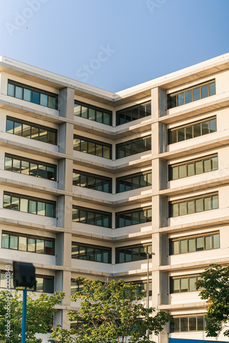 Obraz premium Edificio de oficinas con el cielo despejado azul al atardecer con colores...
