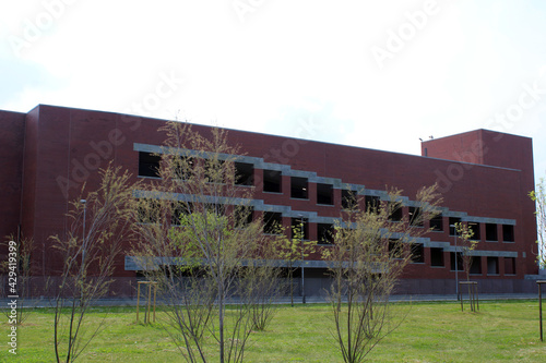 © mauro tombolini, Fototapeta premium Edificio industriale e parcheggio sopraelevato con prato e alberi