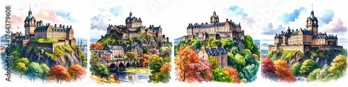 © cloud7days, Naklejka premium Edinburgh Castle, Edinburgh, Scotland handcrafted colored pencil illustration with radiant tones and fine detail.