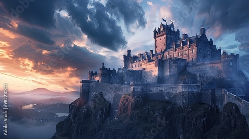 Fototapeta premium Edinburgh Castle-inspired scene with medieval fortress glowing under...