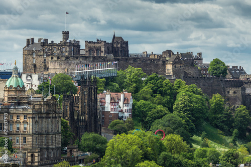 © Klodien, Fototapeta premium Edinburgh, Scotland, UK - June 13, 2012: Looking from Calton Hill upon dark brown castle and flagged esplanade, New College buildings under heavy cloudscape. Greem park.