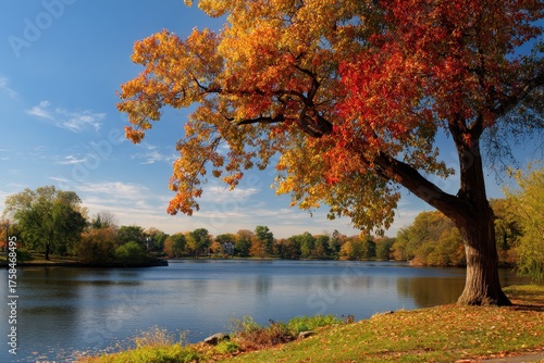 © Mykola, Fototapeta premium Edison New Jersey. Autumnal Landscape with Blue Sky, Trees, and Lake