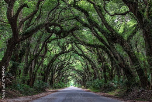 © Oleksandr, Fototapeta premium Edisto Island Tree Tunnel: A Dark Canopy of Botany Bay Backcountry in Coastal South Carolina