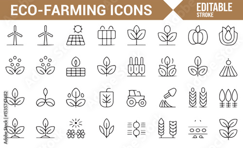 Fototapeta premium Editable vector icons for renewable farming, farm animals, and crop management.