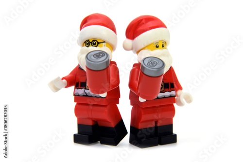 © igradesign, Naklejka premium Editorial illustrative image of lego minifigure of two Santa Claus with Cola cans isolated on white.