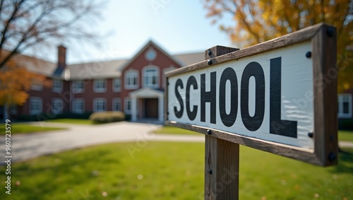 © GMeta, Obraz premium Education Ahead School Sign and Building View