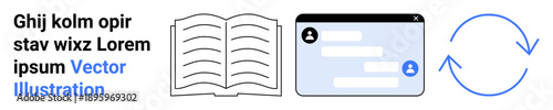 Fototapeta premium Education, communication, technology, digital learning, messaging systems, content refresh. Open book, speech bubble chat box and circular refresh icon. Education and communication