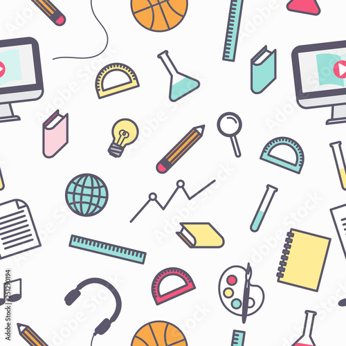 © Sucha Kittiwararat, Obraz premium Education concept in colorful outline cartoon, school equipment seamless pattern