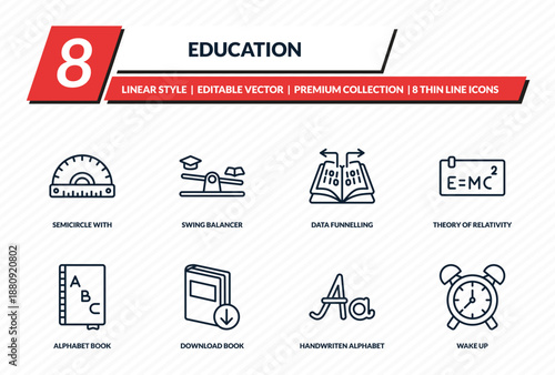 Fototapeta premium education icons set - semicircle with ruler, swing balancer, data funnelling, theory of relativity, wake up outline vector collection.