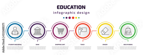 © Farahim, Fototapeta premium education infographic template with icons and 6 step or option. education icons such as student and books, bank, shopping cart, teach, eraser, bag of books vector. can be used for banner, info