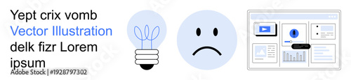 © robu_s, Obraz premium Education, problem-solving, creativity, IT design, software interfaces, visual communication. Sad face, light bulb UI screens with icons. Problem-solving and IT design concept