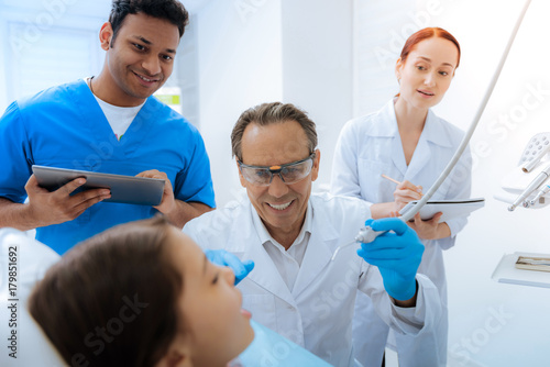 © Viacheslav Yakobchuk, Obraz premium Education process. Nice positive smart interns looking at their mentor and taking notes while wanting to get experience