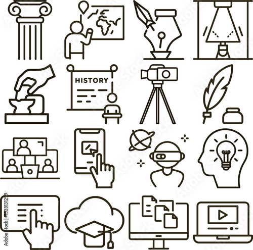 Fototapeta premium Educational and Technological Icons History, Learning, Communication, Media, Virtual Reality, and Creative Thinking Outline Style