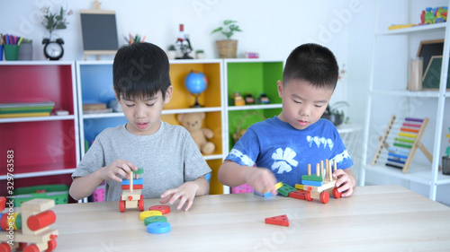 Fototapeta premium Educational concepts. A group of boys playing wooden toys in the classroom, With a bright smiley face.