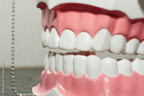 Fototapeta premium Educational dental model, jaws with white teeth close up, front angle view, selective focus