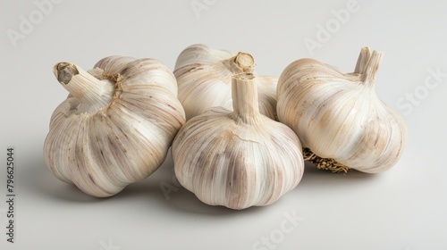 © Paul, Obraz premium Educational image of garlic bulbs highlighting allicin content, isolated on white, showcasing immune and heart health benefits, studio lighting