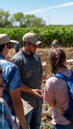 Fototapeta premium Educational Soil Erosion Control Techniques Seminar for Students in Agricultural Field Setting