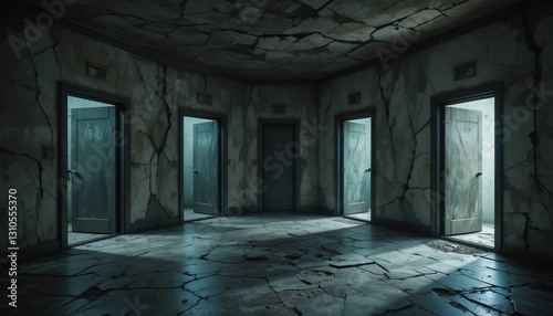 © CooLKenG, Obraz premium Eerie Abandoned Corridor with Cracked Walls Open Doors and Dark Atmosphere