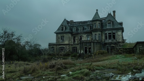 Fototapeta premium Eerie Abandoned Mansion: Haunting Atmosphere of Neglect with Broken Windows and Desolate Garden on a Hill under Overcast Sky