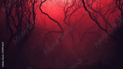 Obraz premium Eerie and Mysterious Forest Scene with Tall Twisted Trees and Deep Red...