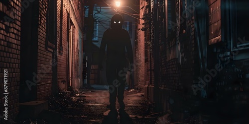 Fototapeta premium Eerie Comic Book Style Illustration of a Dark Figure with Glowing Eyes in an Alley. Concept Comic Book Illustration, Eerie Art, Dark Figure, Glowing Eyes, Alley Scene