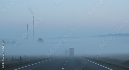 © Clara Elizabeth, Fototapeta premium Eerie Dawn Drive Trucks Vanish into Fog Toward Industrial Smokestacks.