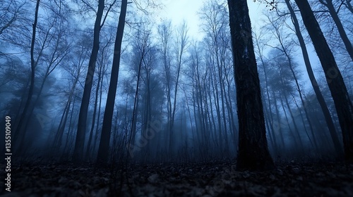 Fototapeta premium Eerie fog envelops tall trees in dark forest creating a mysterious and...