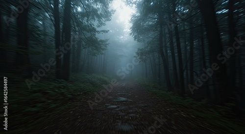 © Fauzi, Naklejka premium Eerie Forest Path with Motion Blur and Mystical Fog, Leading to a Bright Unknown