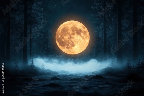 Fototapeta premium Eerie Full Moon Illuminates a Mystical Forest, A Stunning Nighttime Scene of...