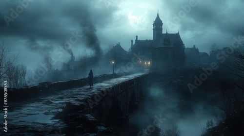 Fototapeta premium Eerie Ghost on Foggy Bridge in Gothic Town at Night