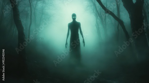 Fototapeta premium Eerie Ghostly Figure in Misty Forest: Haunting Presence Among Twisted Trees...
