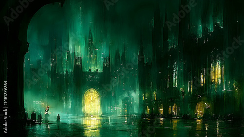 © Lestari, Naklejka premium Eerie, glowing city at night reflected in dark water; mysterious figures stand near a large, luminous gate