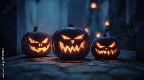 Obraz premium eerie glowing Halloween pumpkins dark street