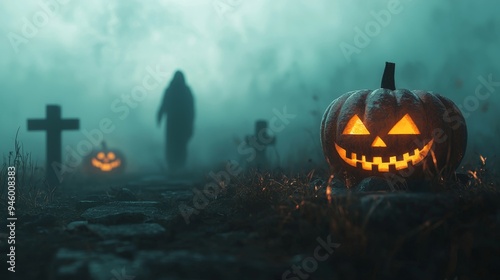 Naklejka premium Eerie Graveyard Scene with Glowing Jack o Lantern and Foggy Atmosphere on...