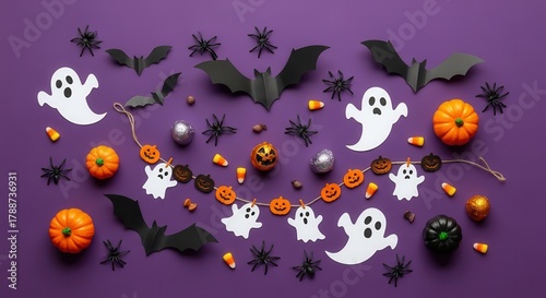 © imagera, Naklejka premium Eerie Halloween flat lay featuring ghosts, bats, candy corn, pumpkins on purple background perfect for designs