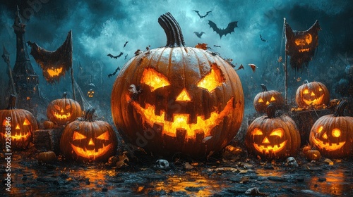 © Ummeya, Fototapeta premium Eerie Halloween Pirate Flag with Pumpkins in Flat Design