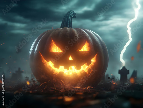 © Earny, Naklejka premium Eerie Halloween pumpkin glowing with sinister expression in a haunting graveyard setting.