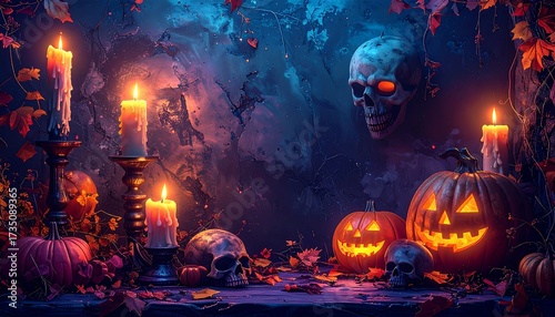 Fototapeta premium Eerie Halloween Scene: Glowing Pumpkins, Dripping Candles, and Floating Skulls Under a Mystical Night Sky