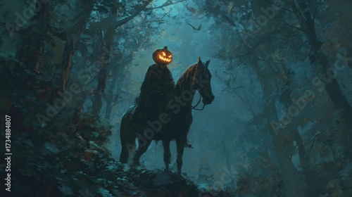 © marfuah, Fototapeta premium Eerie Headless Horseman in Dark Forest with Glowing Pumpkin.