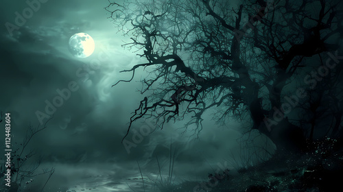 Naklejka premium Eerie Moonlight: A hauntingly beautiful image of a gnarled tree silhouetted against a full moon, bathed in an ethereal, moonlit glow. The misty.