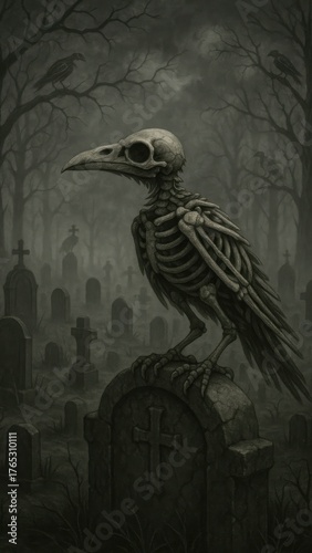 © Rawpixel.com, Fototapeta premium Eerie raven skeleton graveyard mobile wallpaper